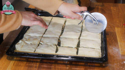 - Fırın tepsinizi hafif yağlayıp birinci grubu tepsi ebatında açın ve tepsiye yerleştirin. Üzerine ıspanaklı harcı yayın. İkinci hamuruda açıp üzerini kapatın. Yanlardan birleştirip karelere kesin.