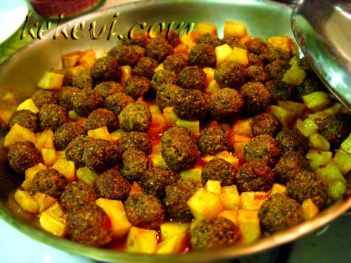 - İsteseniz kofteleri kizarttiktan sonra kup kup dogranmis, soguk suda bekletilip kurulanmis 2-3 buyuk patateside tavada kizartip hepsini birlikte salcali sos ile pisirebilirsiniz.