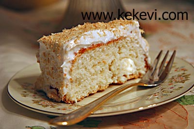 - Keki bir bıçak yardımıyla çıkarıp kremayı sürün. Kavrulmuş hindistan cevizini serpin.