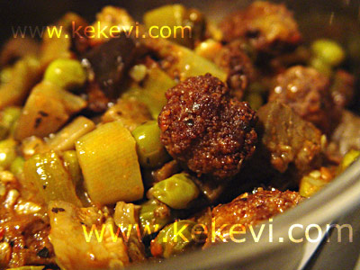 - Baharatlarını koyup biraz karıştırdıktan sonra servise yakın üzerini geçmeyecek kadar yeterince kaynamış sıcak su ilave ederek 200C dereceli fırında 20-30 dakika pişirdikten sonra sıcak olarak servis yapın.