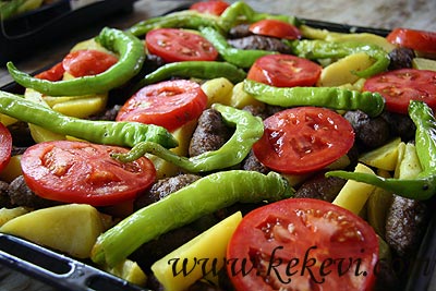 Once patatesleri, sonra kofteleri hafif pisecek kadar kizartin. Tepsiye dizin. En son biberleride hafif dirilikleri gidecek kadar kizartip ustlerine yerlestirin.