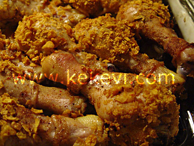 - Tavukları sostan alıp tek tek mısır gevreğine bulayıp kenarları yüksek fırın tepsisine yerleştirin.