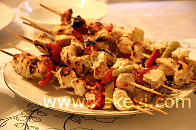 - Şişlere tavukları, aralarına domates ve biberler koyarak geçirin.
