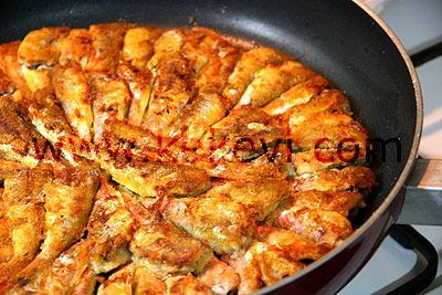 4. Süzdürüp mısır ununa bulayarak 2 yemek kaşığı kadar sıvıyağ gezdirilmiş yapışmaz tavaya istavrit ve hamside olduğu gibi çiçek şeklinde dizerek kızartın.