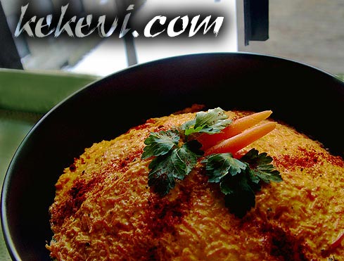 5. Servis tabağınıza alıp oval hafif kubbeli sekil verin. Çizgi halinde toz biber serpiştirin. Ortasını ufak havuç veya havuç dilimi ve maydanoz ile süsleyin. Salatanız servise hazırdır.