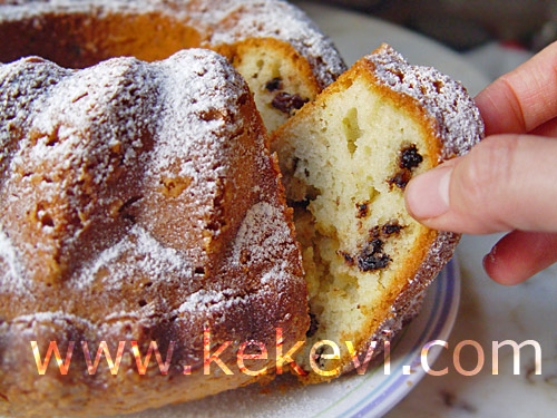 - Not: Kek hamurunuz çok cıvık olmadığı sürece üzümler dibe çökmeyecektir. Ancak çökme riskine karşı kuru üzümün yarısını kek kalıbına yerleştirdikten sonra üzerine serpiştirip çatalla hafif kek hamuruna bulayabilirsiniz