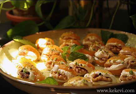 4. Soğuduktan sonra kayısıları tek tek şerbetlerinden hafifçe süzüp içini acın. İçine yarım tatlı kaşığı kadar kaymak ve badem veya ceviz parçası yerleştirip servis tabağına dizin.