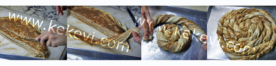 - Fotoğrafta görüldüğü gibi hamuru yaklaşık 2cm. genişliğinde şeritlere kesip burarak uzatın ve hafif yağlamış tepsiye ortadan başlayarak dizin.