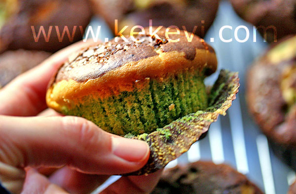 - Kağıt serilmiş muffin kalıplarınıza önce ıspanaklı harcı paylaştırın. Ardından sade hamuru ve en son kakaolu hamuru kalıplara paylaştırıp üzerlerine iri tozşeker serpiştirin.