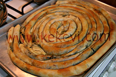 - Artık çekilmeyecek kadar hamur inceldiğinde ortadan kesik atıp büyük simit halkası gibi olan hamuru hafif çekerek uzatıp, yağlamış yuvarlak fırın tepsisine ortadan başlayarak spiral şeklinde yerleştirin.