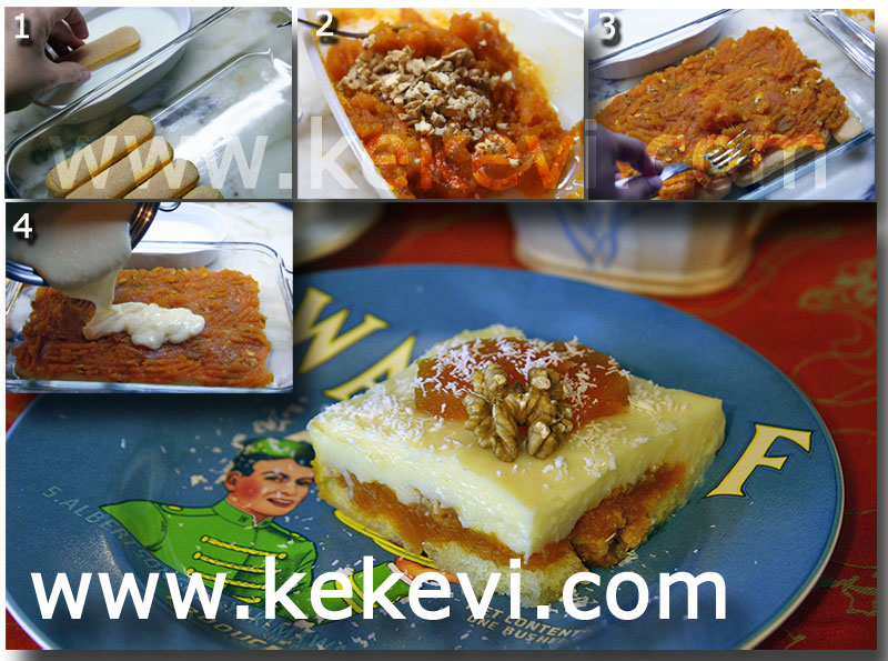 - Balkabağı tatlılarını mümkünse şerbetiyle beraber çatalla ezin ve ceviz veya fındığı ilave edip karıştırın. Bisküvilerin üzerine yayın.