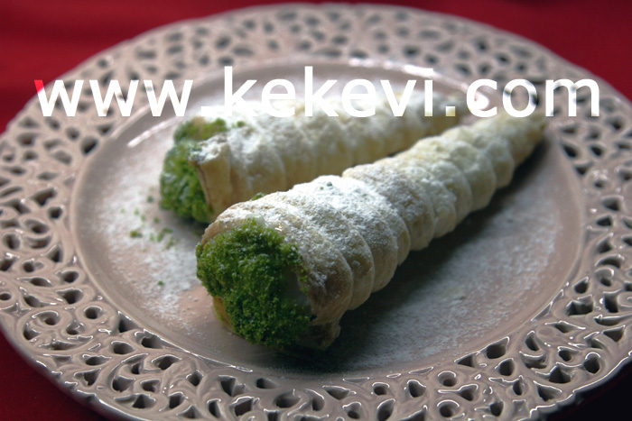 - Servis zamanı külahları krema ile doldurup antep fıstığına batırın. Pudra şekeri eleyerek servis yapın.