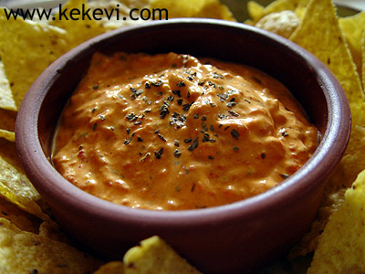 - Hazirladiginiz sosu ayridan koydugunuz kucuk bir kabin icinde genisce bir servis tabaginin ortasina yerlestirin. Yanlarina tortilla misir cipsi ilave edip servis yapin.