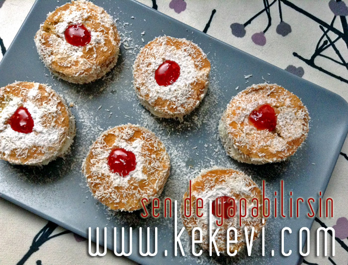 - süslemek için: hindistan cevizi, pudra şekeri, frambuaz reçeli