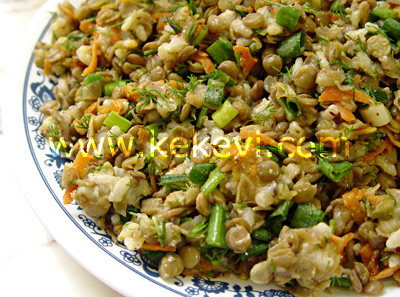 3.Mercimeği süzüp pirinçle karıştırın. Soğanı ince doğrayıp yağda biraz kavurun.