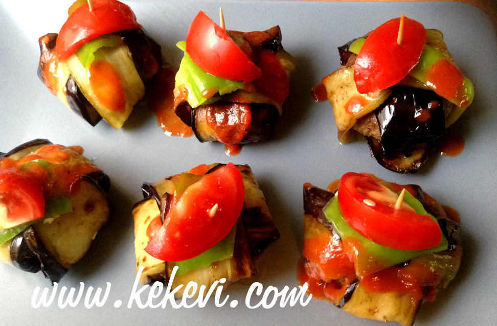 - Patlıcan dilimlerinin ikisini tezgaha artı şeklinde yerleştirin ve üzerine köfte koyup şeritleri köftenin üzerine bohça gibi kapatın.