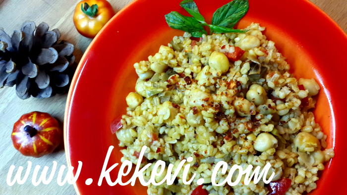 Nohutu ve sebzeleriyle hepsi bir arada pratik ve leziz bir bulgur pilavı. Bir çorba veya yanına ayranla tek başına menü yapabilirsiniz..