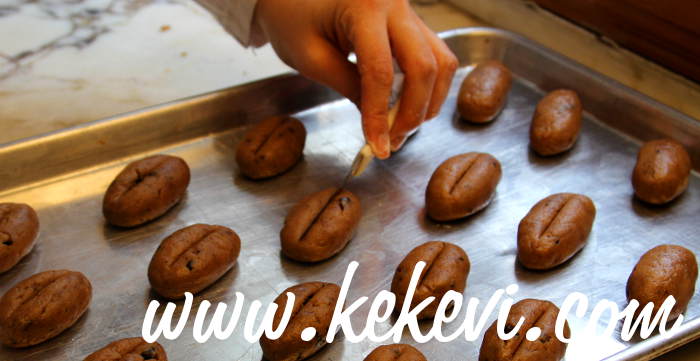 - Oval şekiller verip aralıklı tepsiye yerleştirin. Bıçağın tersiyle ortalarına çizikler atın. 170C dereceli fırında kabarıp hafif sertleşene kadar (yaklaşık 35 dakika) pişirin.