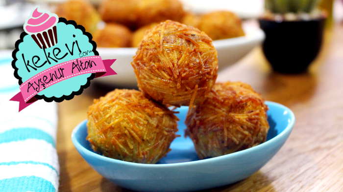 Çıtır Kaplamalı Patates Topları… Yine pratik bu mini lezzetleri çok seveceksiniz. Dışı tel şehriye kaplaması içi baharatlarla lezzetlenmiş yumuşak patates ile nefis bir patates kroket çeşidi. İçine taze otlar ve lor peyniri de karıştırabilirsiniz. Dışını da isterseniz susamla batırıp farklı çeşitler deneyebilirsiniz.