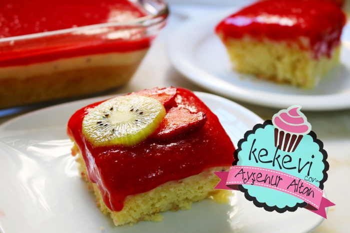 Fırın tepsisinde pişireceğiniz yumuşacık ve yapması kolay bir kekin üzerinde kat kat kivili irmik kreması ve çilek sosu ile meyve dolu nefis tat…