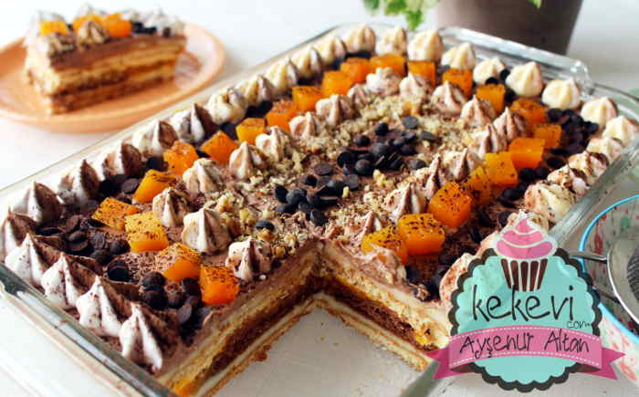 Bisküvili pasta sevenler için kat kat renkli kreması ve gösterişli ama basit süslemesiyle balkabaklı çikolatalı nefis bir bisküvili pasta tarifim var.