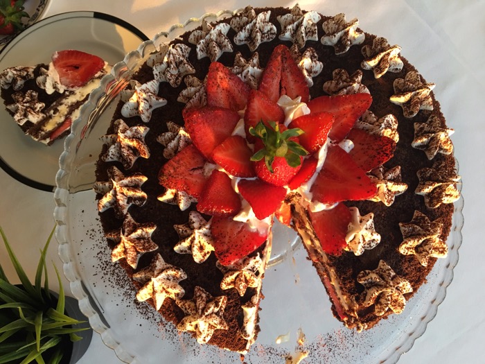 - Pasta kremasının yarısını pandispanya üzerine yayıp çilek dilimleri ile kapatın.