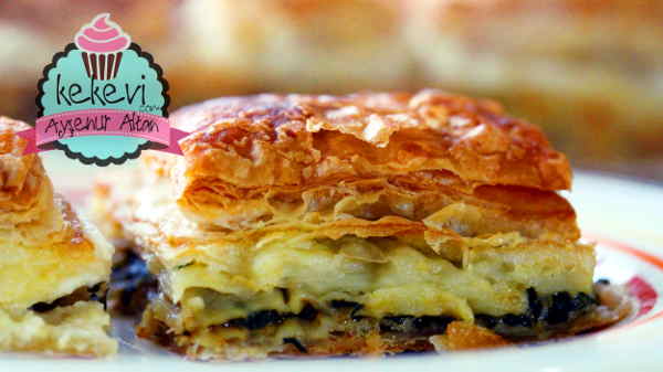 - Yufkanın birini kenarlardan sarkıtarak yerleştirin. İçine ikinci yufkayı büzerek koyun ve sosla bolca heryerini ıslatın. Tepsinin yarısına Peynirli, yarısına Ispanaklı harcı yayın. Sarkan yufkayı üzerine kapatın. Kapatırken her tarafın yine iyice sosa bulunmasını sağlayın. En üstü kalan milföy hamuru ile aynı şekilde kaplayıp bıçakla karelere kesin. Kalan sosu üst kısma yayıp ısıtılmış 200C fırında altı üstü kızarana kadar pişirin.