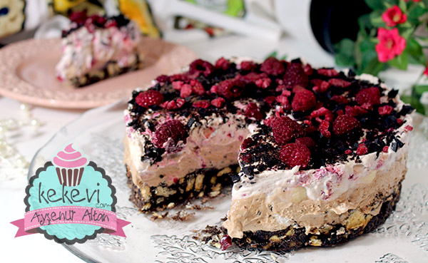 Mozaik pasta tabanlı, çikolatalı ve frambuazlı krema katlarıyla bu muhteşem görünümlü 🙂 pastayı çok kısa bir sürede üstelik ne fırın ne ocak açmadan yapabilirsiniz 😊👍