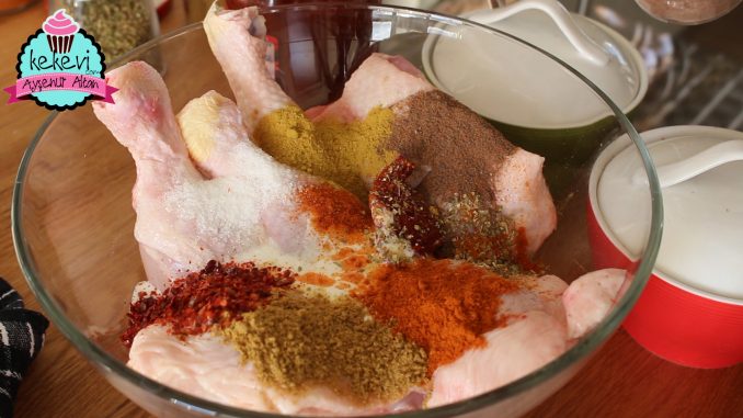 - Yoğurt, sıvıyağ salça ve baharatları tavukların üzerine alıp karıştırın.