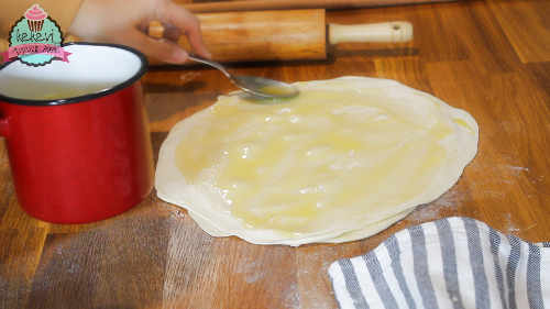- Bezelerin dördünü merdane ile servis tabağı büyüklüğünde açıp aralarını yağla yağlayarak üst üste koyun. En üstü yağlamayın. Diğer 4 bezeyede aynı işlemi uygulayın. Bunlar böreğin alt ve üst kısmını oluşturacak.